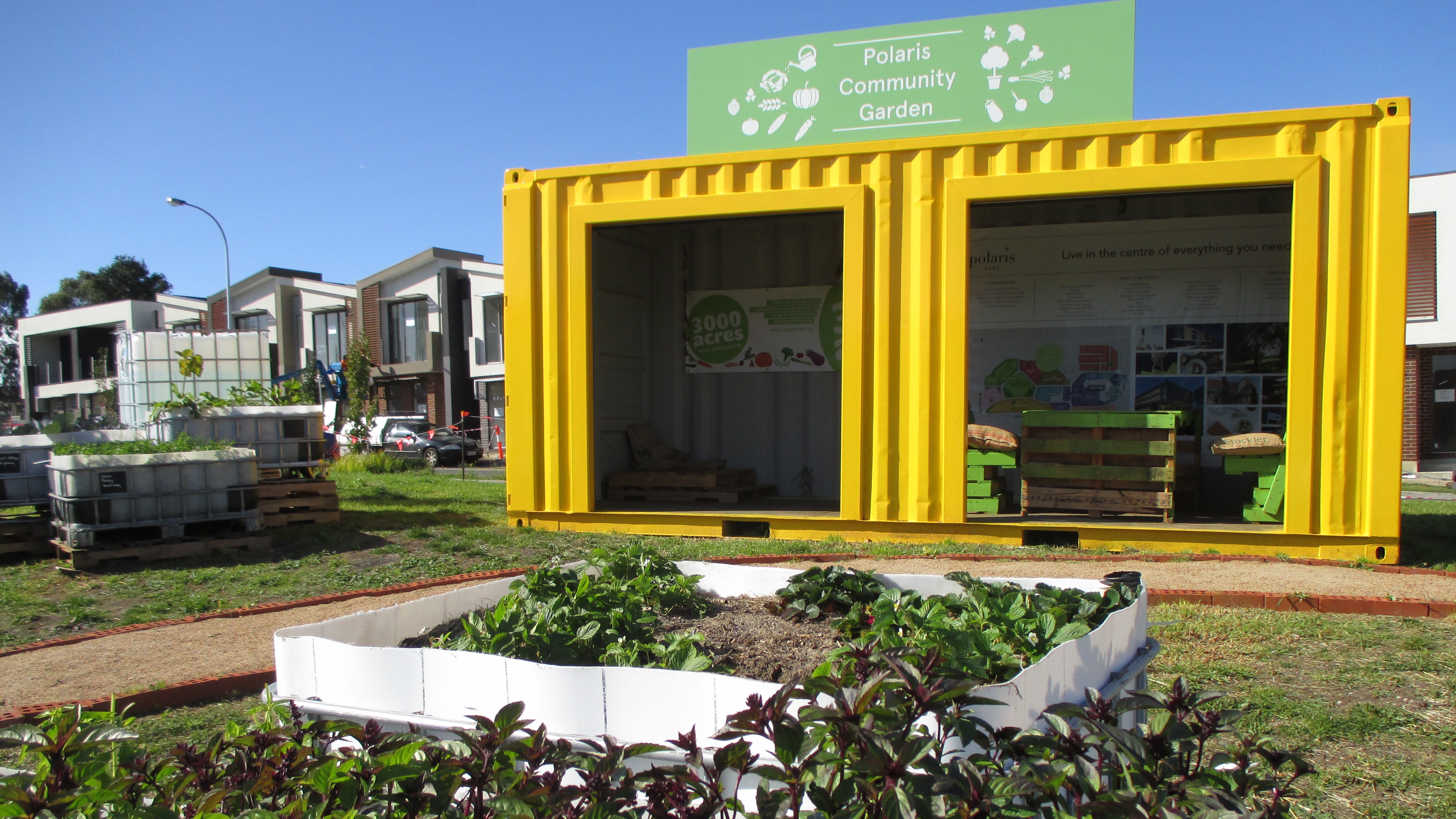 - The 3000acres community gardens are designed to be more than just places to grow food, but local hubs of community activity. This is achieved by running a regular events program and by installing infrastructure to facilitate social engagement, including seating, shade and barbeque facilities where possible.