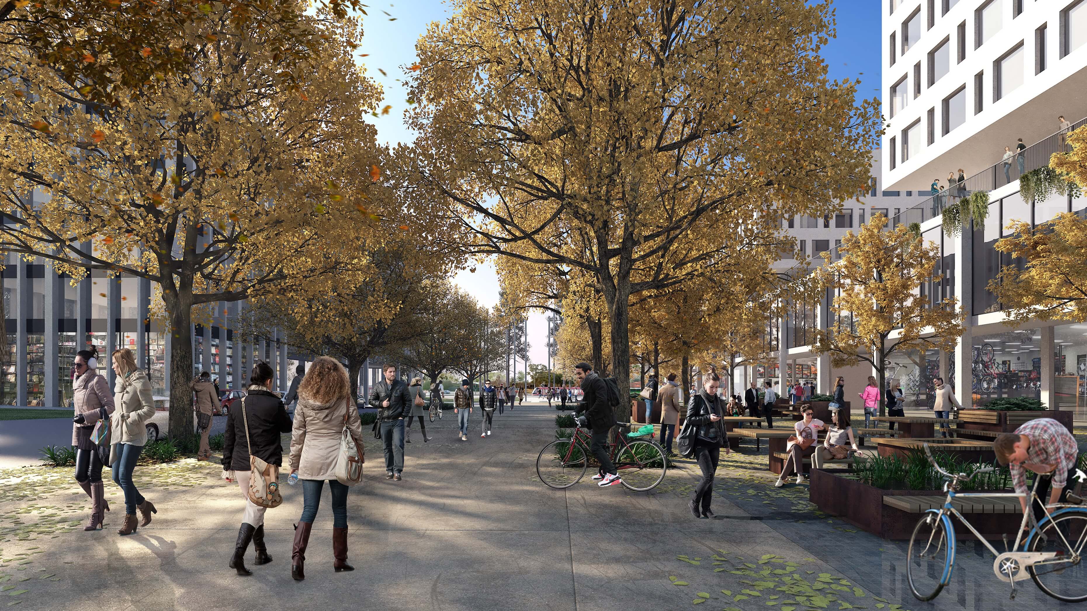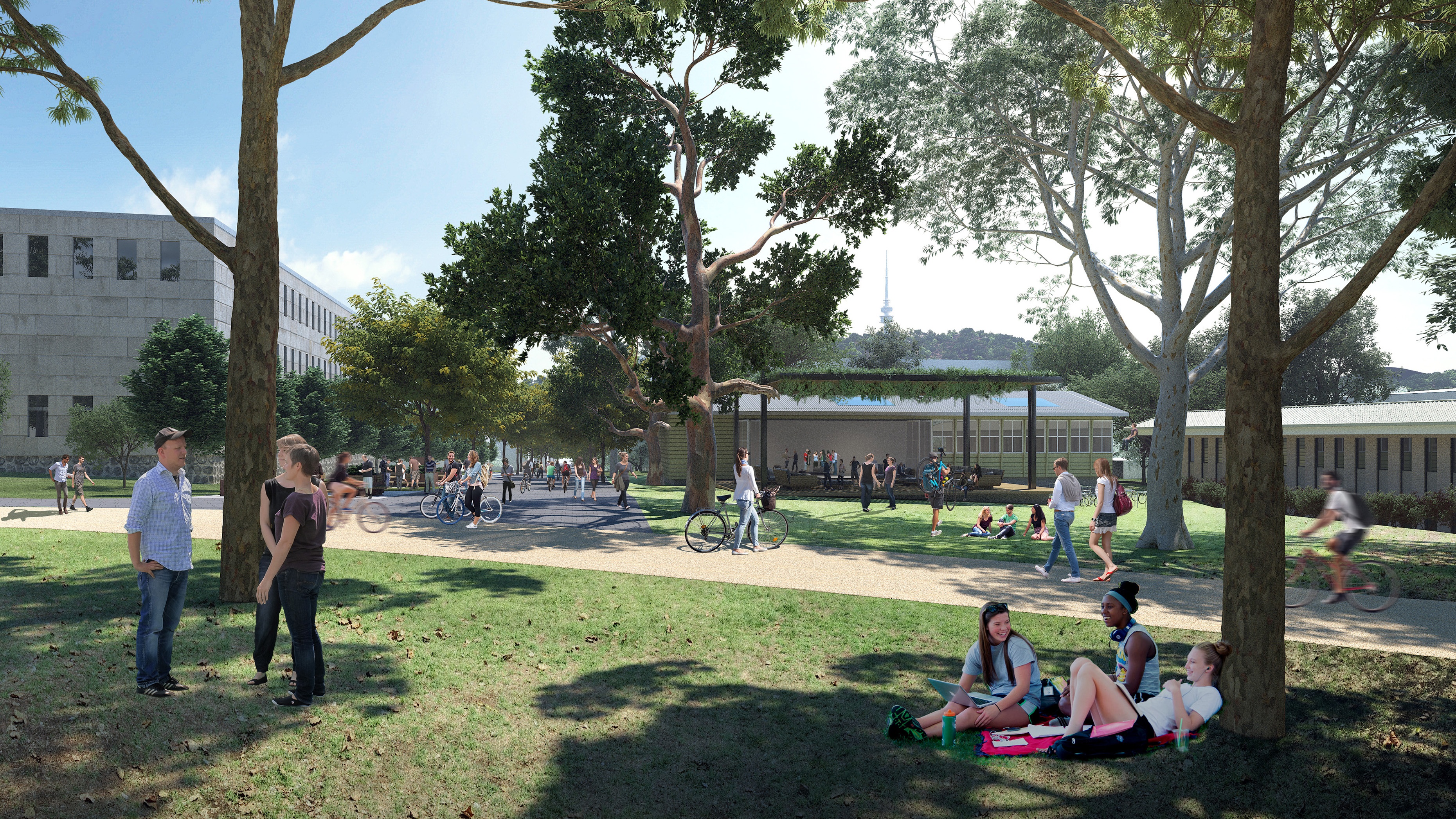 - The clear and connected network of nine tree-lined, landscaped promenades will establish a network of shady, sheltered pathways that offer a comfortable environment to encourage safe and easy cycling and walking through the day and night. The promenades will be the busiest pedestrian routes on campus, in contrast to the bush backdrop, which will provide spaces for quieter, more reflective uses and recreation.