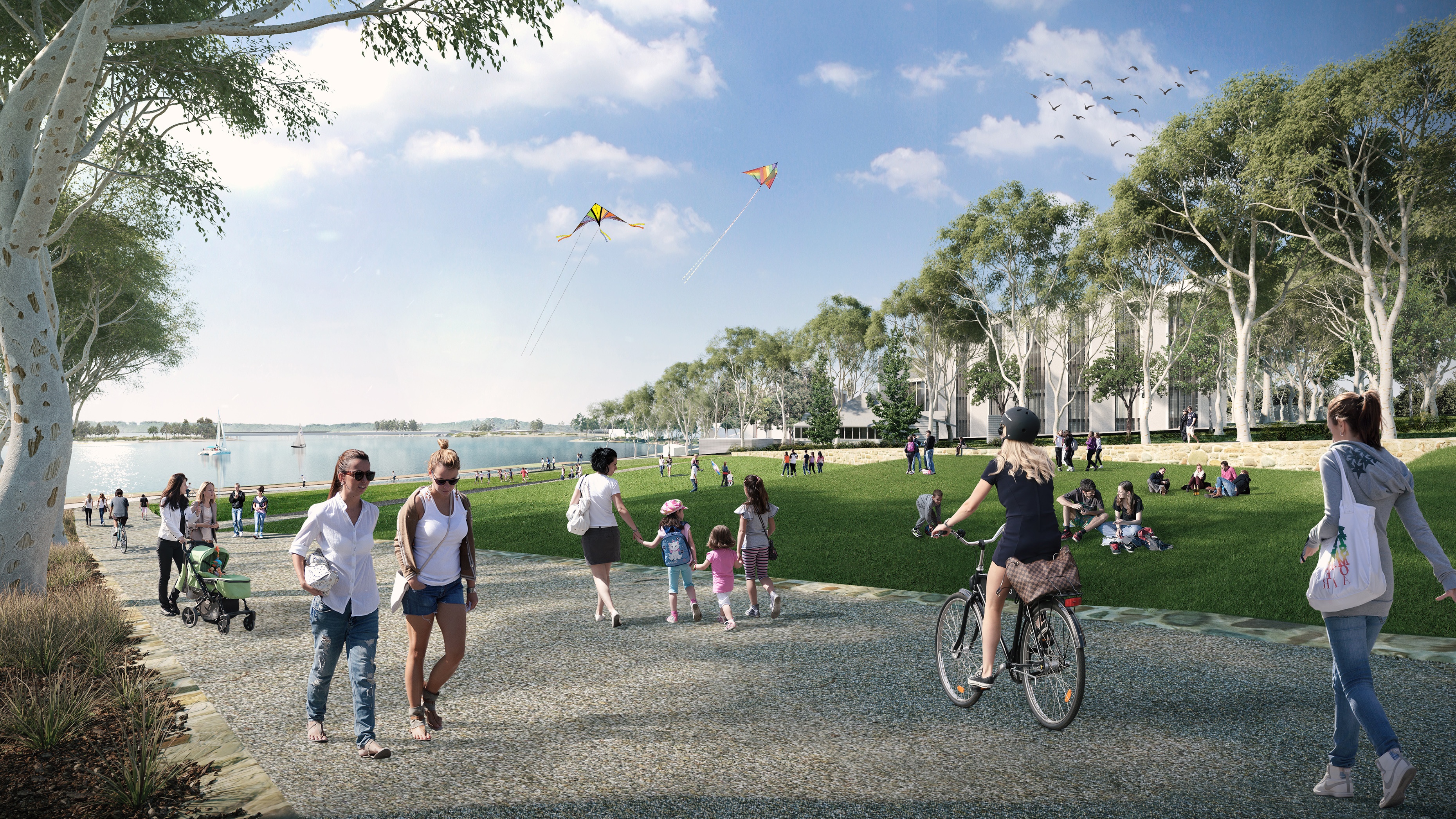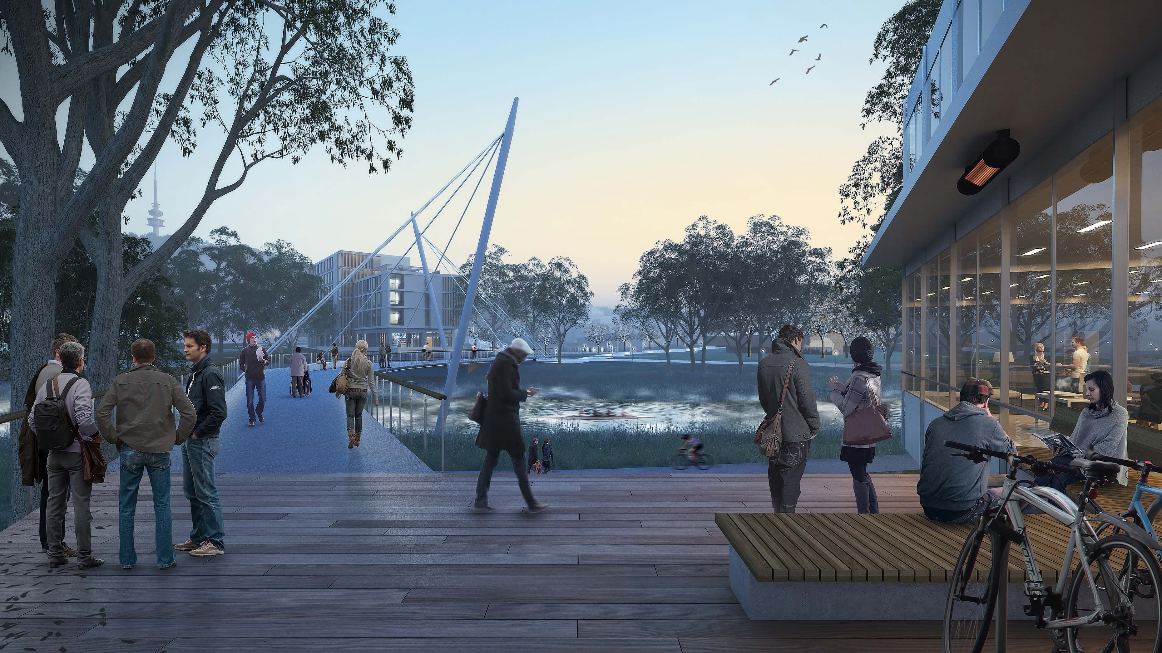 The promenades facilitate healthy, active behaviours through enhanced options for walking and cycling across campus and between wider city connections, where catalytic redevelopment projects, new community spaces and active transport links complement the existing university education and residential uses. The hubs will be home to curated exhibition spaces for ANU collections, small-scale events and flexible teaching/learning, while new park links will engage with Lake Burley Griffin, providing opportunities for community events connected to the West Basin foreshore
