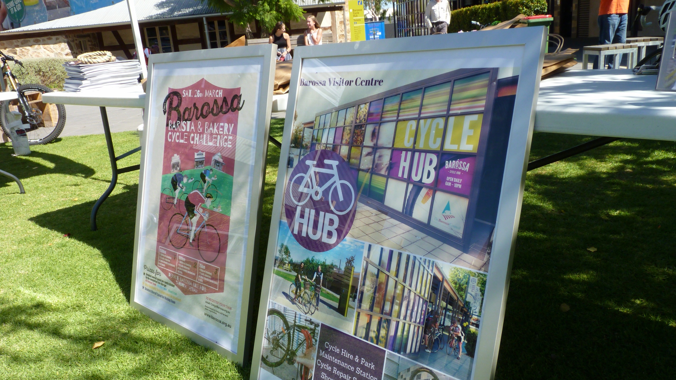 The Cycle Hub in Tanunda is located on the Jack Bobridge Track and Barossa Trail and offers access to bicycle repair, hire and storage services, change rooms, water and local information. A backlit sign displays a map of Barossa cycling routes. The Cycle Hub operates for extended hours (6 am to 10 pm daily), to cater for shift workers and early morning cyclists. Shade and seating increase the amenity of the hub. It also provides a venue for cycling based events and is used by cycling groups. It is located next to the Barossa Visitor Centre in Tanunda, and at the front of the hub is the CWA Hall, available for community group hire. Along with public open space on the main street, this area is known as the Tanunda Town Square.