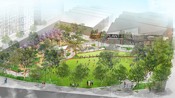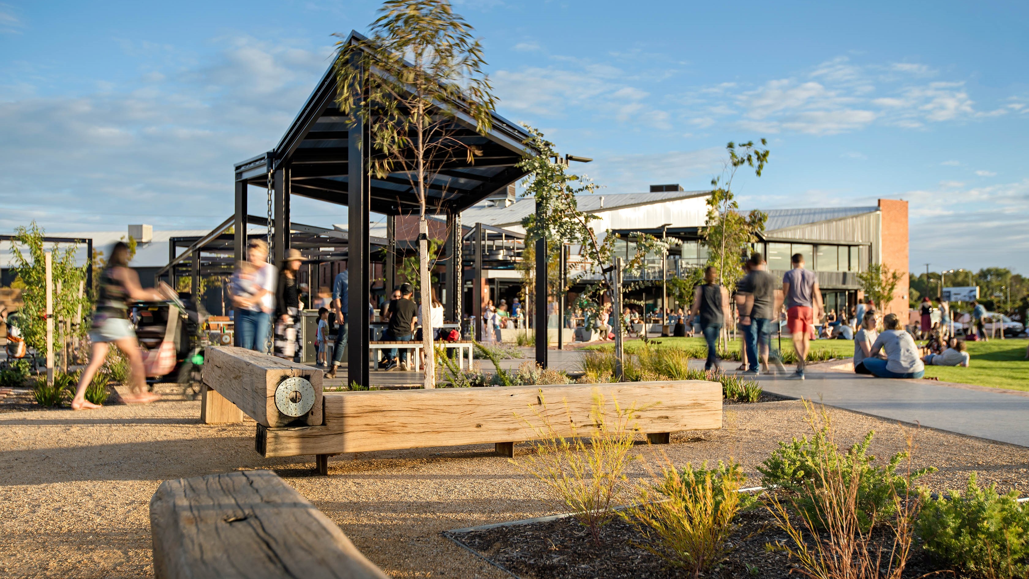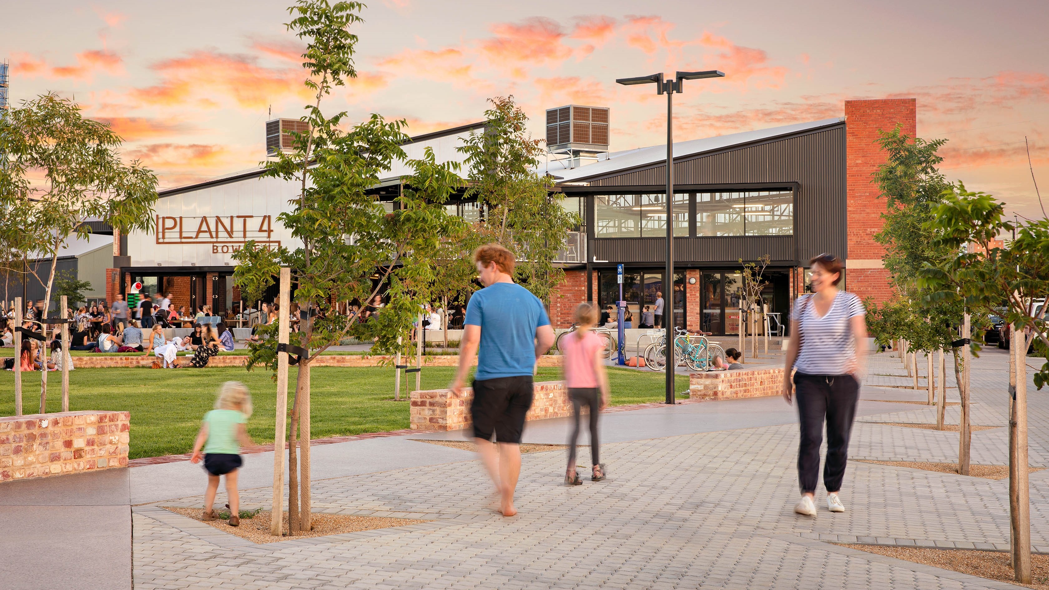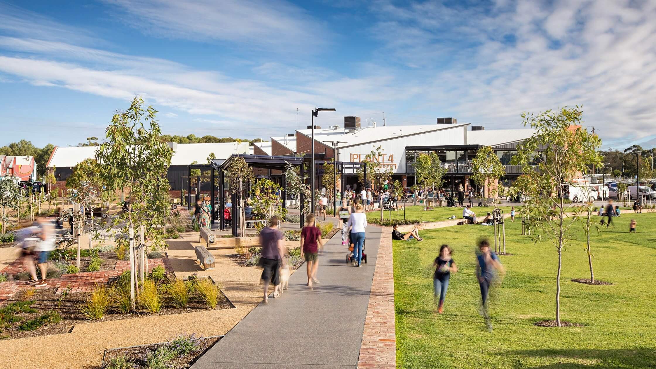 A series of connected pathways invites people in from all directions, adding to the walkability of the site and providing scootering, or skating opportunities around the park. Bins, water fountains, bike parking and cycle repair are all provided encouraging active transport and longer stays. In addition, a long shelter with picnic and barbeque areas, and a small play area with water jets is popular with families; with surveillance over this play space possible from café seating. As the trees grow in the park even more shade will be provided. The adjacent Plant 4 building provides further shaded seating, accessible toilets, baby change and other amenities.