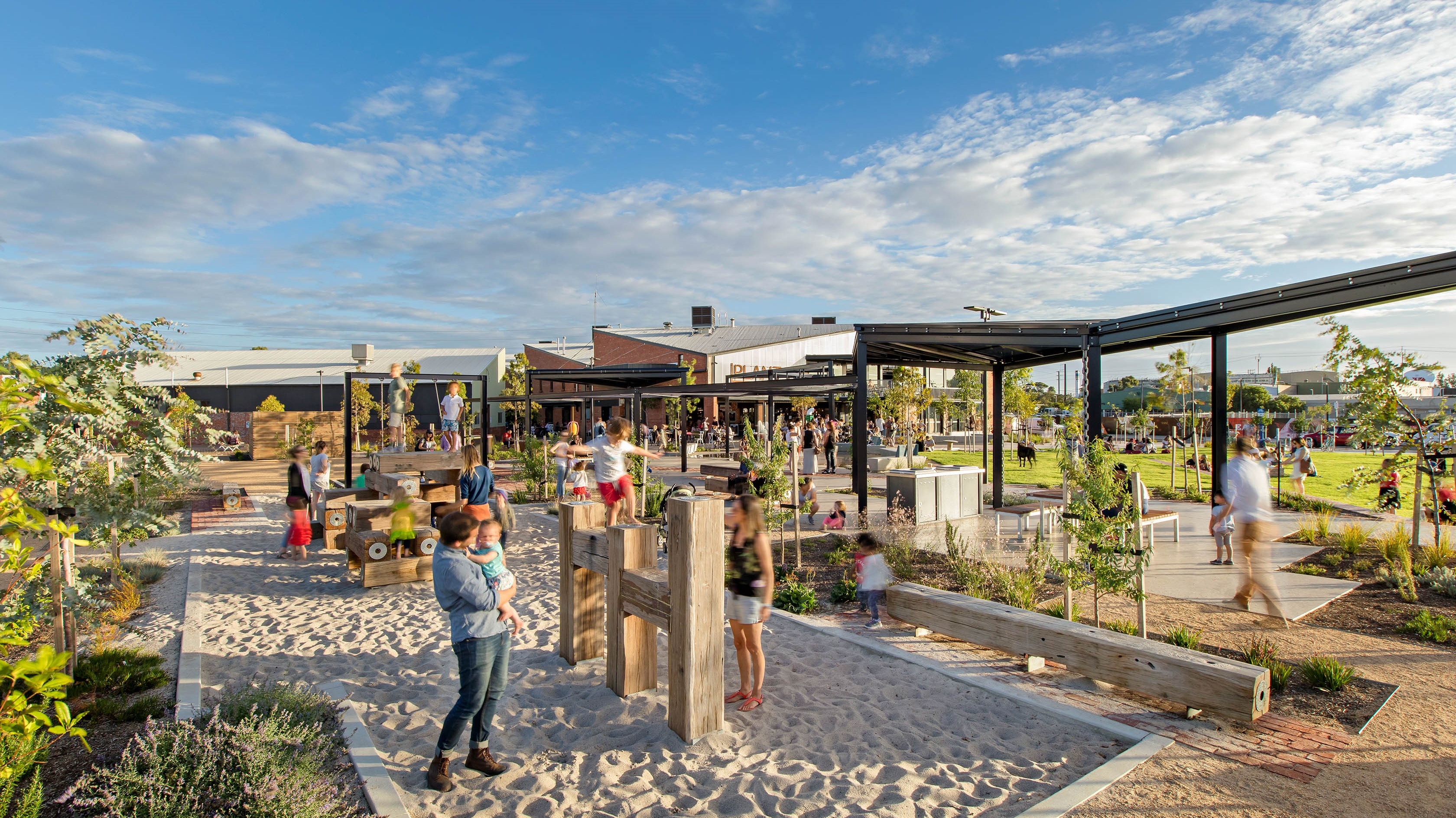 The park is immediately adjacent to, and was developed in conjunction with the refurbishment of the old Clipsal ‘Plant 4’ factory building – now incorporating a small supermarket, cafes, bar, markets (bi-weekly), specialist stores, and event spaces. Bowden Park is in contrast to the redevelopment’s reuse of the remaining industrial buildings and an attractive destination for the surrounding community.