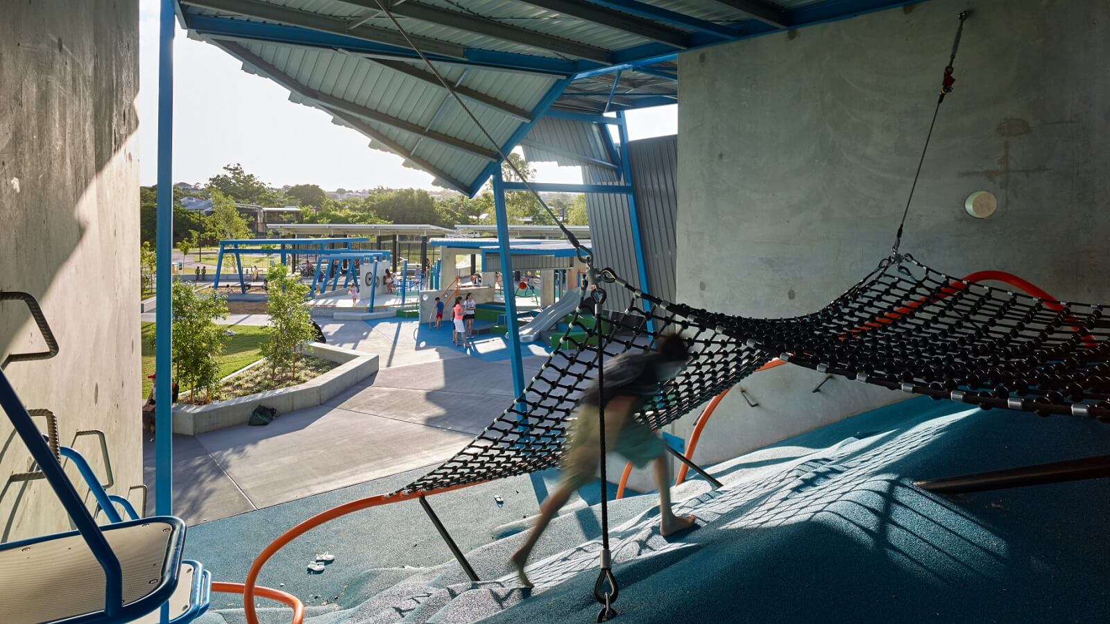 Brisbane City Council’s project team developed an innovative concept for the playground, based on the former tennis centre grandstand, where a perimeter shell structure acts as the focus of the play experience.