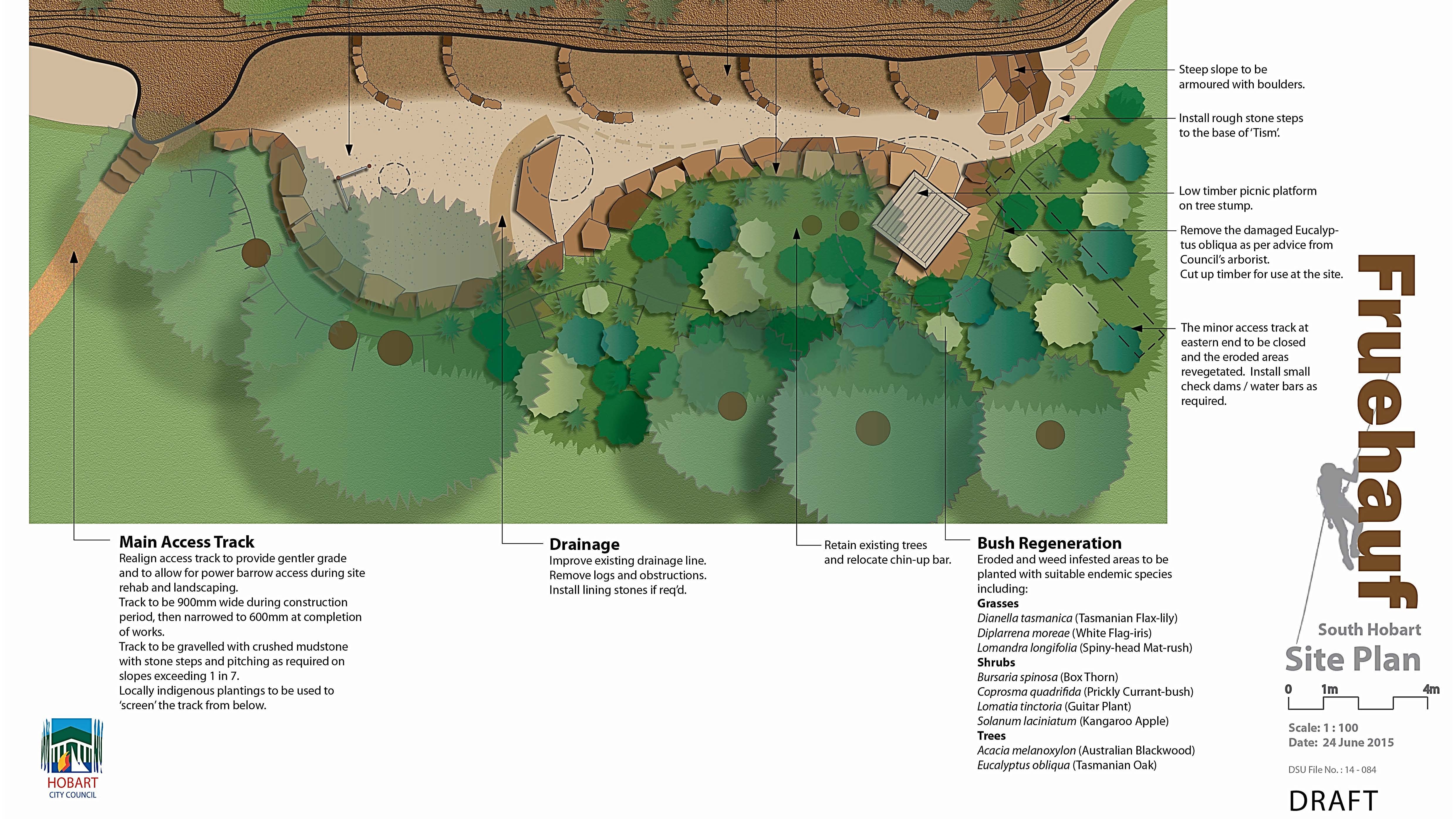 The Fruehauf site plan is an example of a successful collaboration between the community and the City of Hobart. The project was founded on a robust targeted community engagement process, empowering community champions, and leading to long-term stewardship outcomes – a result the City strives for all volunteer groups operating under its Bushcare program.