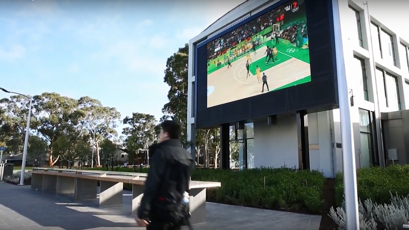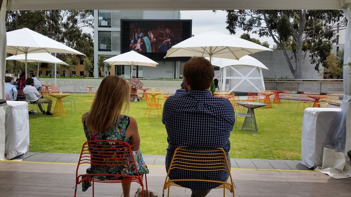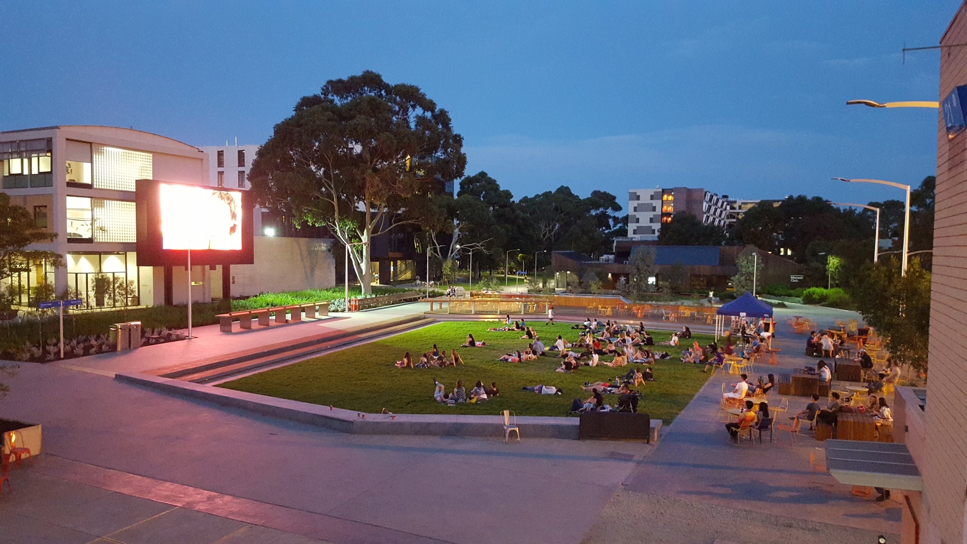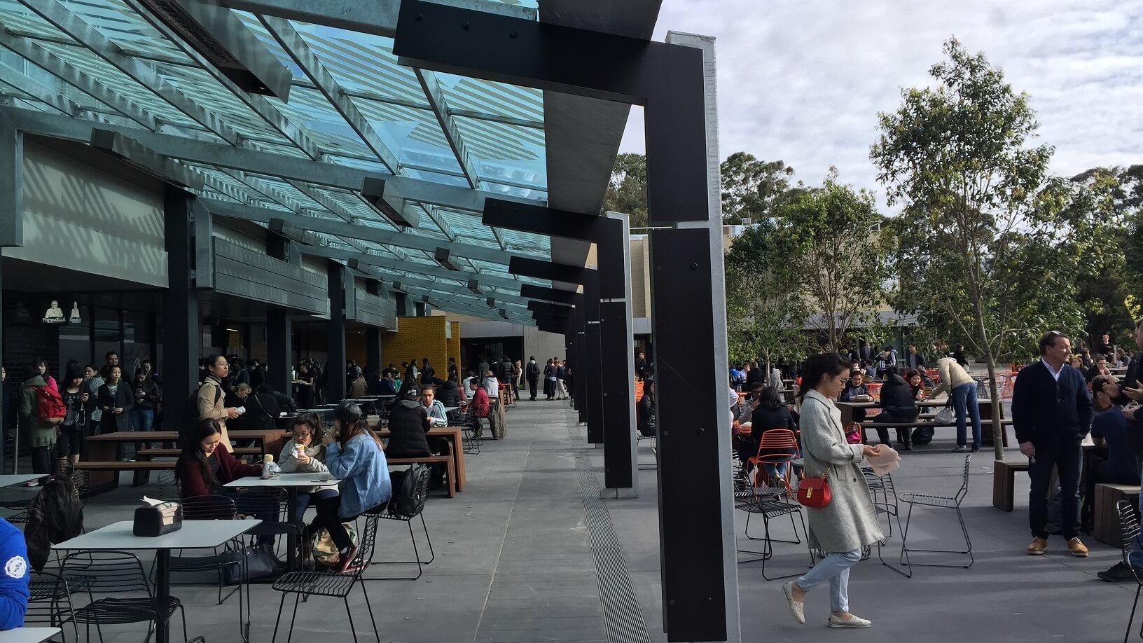 A large LED television (‘the Big Screen’) broadcasts news, movies and major events into the Northern Plaza. Internal retail spaces within the Campus Centre were also upgraded, and a central services hub with ATMs, bank branches and a post office was created. The Northern Plaza now brings together more than 30 retail experiences and nine new food outlets, with an alfresco dining area looking out over the Lemon Scented Lawn beneath a shaded glass canopy.