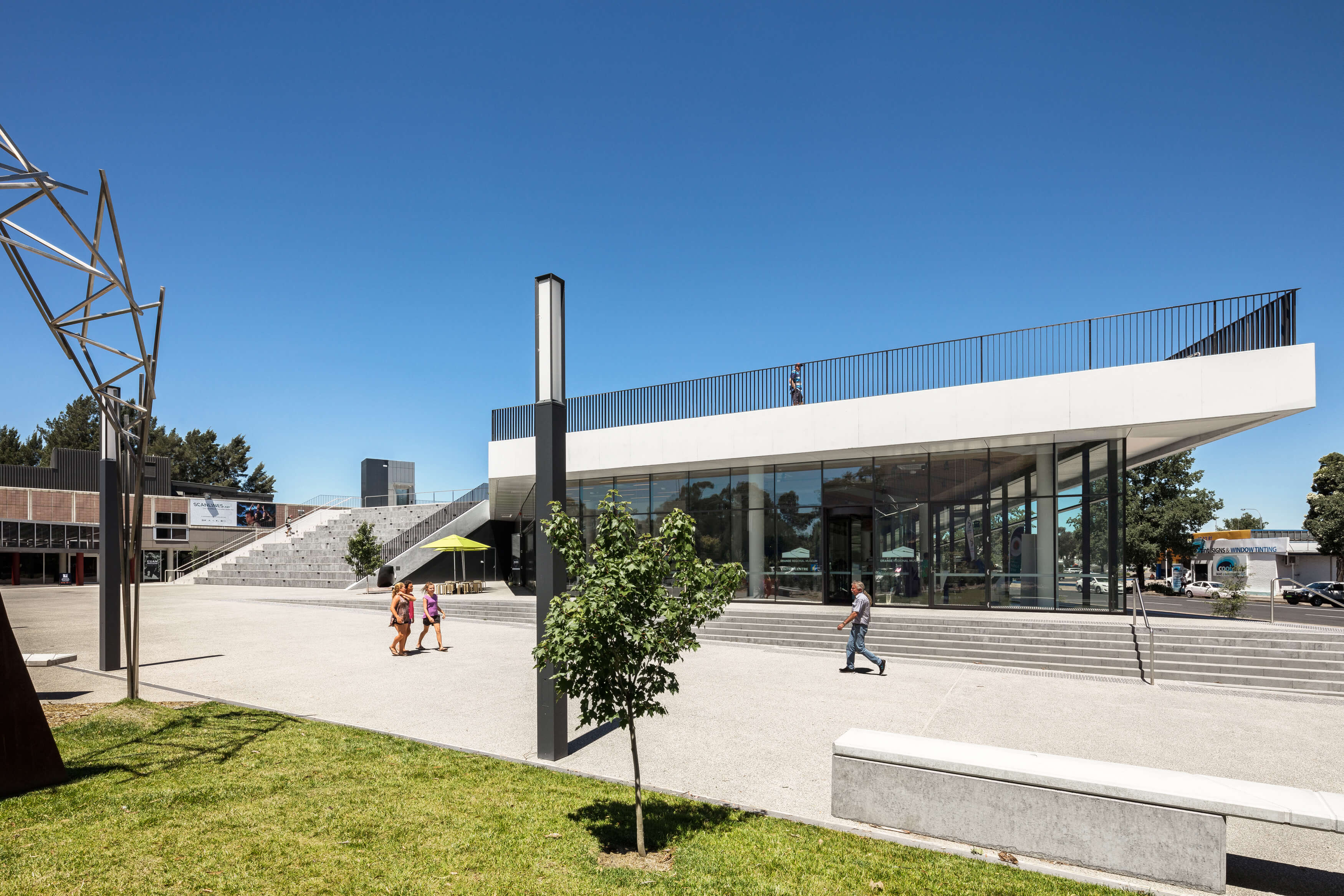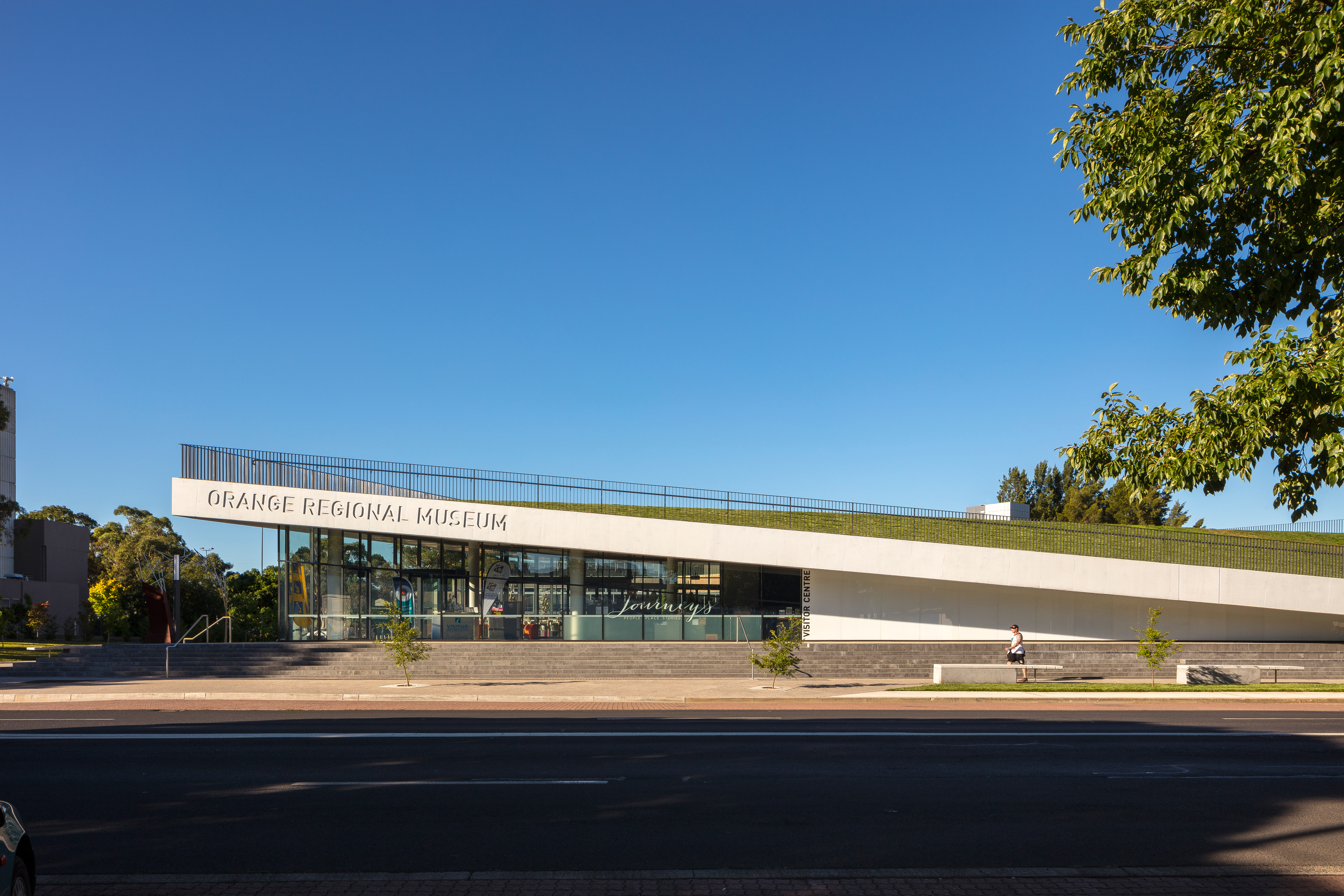 The building is visible through Robertson Park and has multiple facades. The six-metre high grassed roof is a defining feature of the design, rising from the existing lawn, providing a public green space and new vantage point to the adjacent Robertson Park and across Orange City. Intended as a flexible space, the lawn can be used for a variety of functions including outdoor exhibitions or simply an area for visitors to relax. For those unable to walk up the ramp or the stairs, there is a lift available to access the lawn.