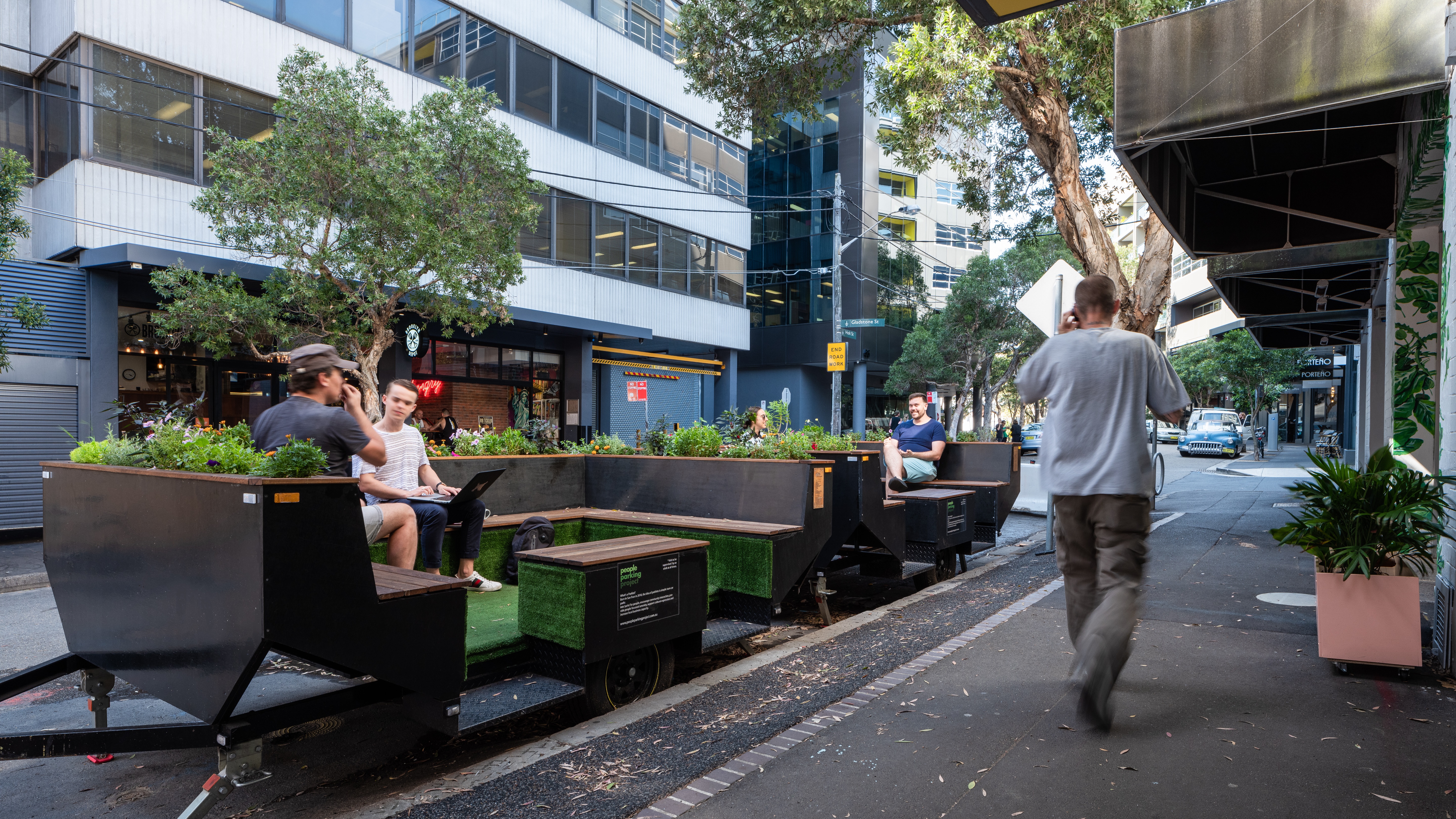 People Parkers are a collective of Sydney-based architects and entrepreneurs who create products designed to “park people in public spaces”. The collective was formed in 2016 during the evaluation process of Sydney’s first mobile parklet project. This was a community led initiative whereby a series of carparks along a historical high street in Sydney’s Inner West were converted into parklets.