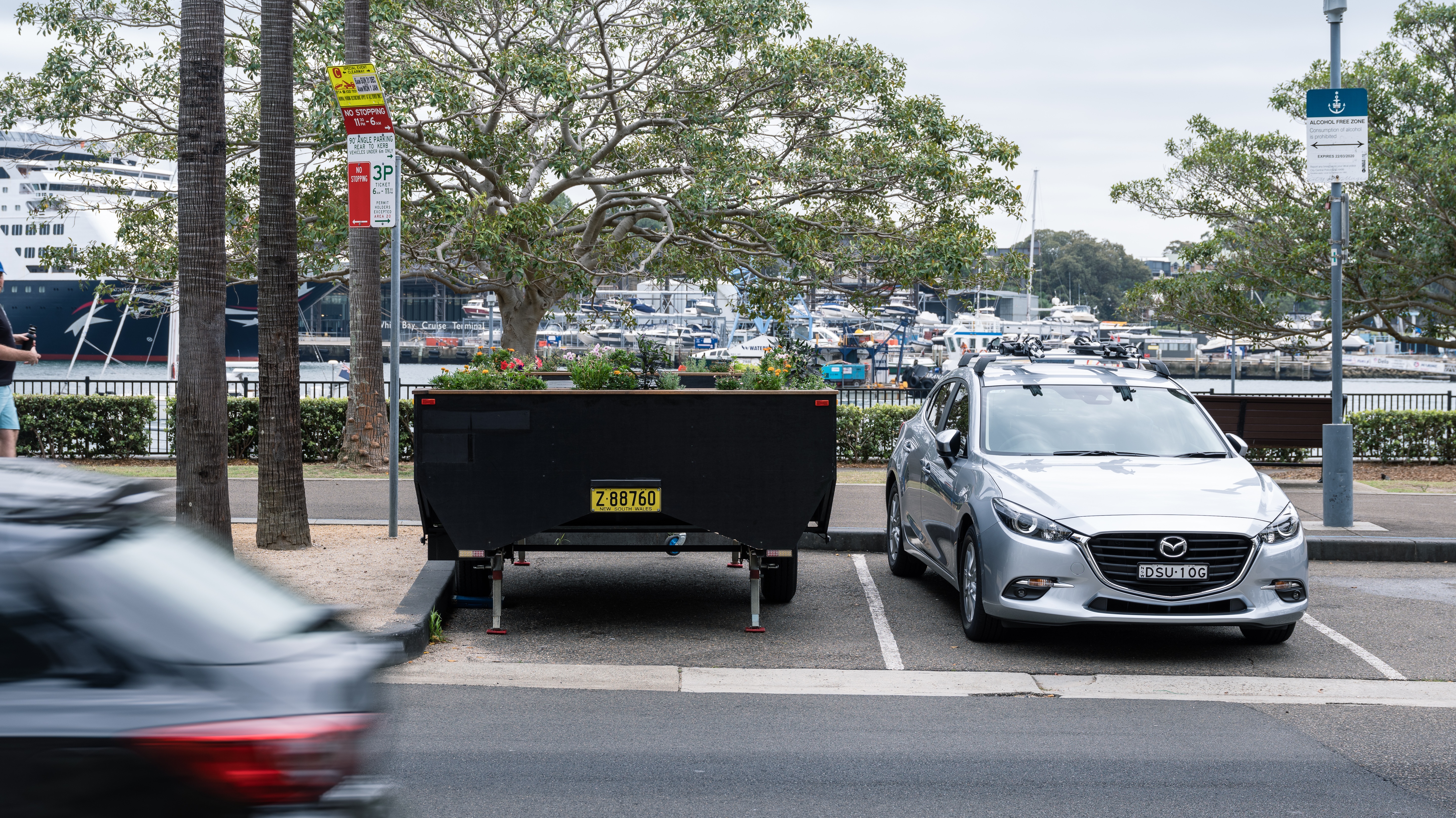 The assets were designed to remain within the legal dimensions of a standard car trailer in order to be registered in NSW. They occupy one standard car park each and can be joined together to create multiple seating areas as required. The assets can be towed by any size of vehicle and legally set up in any suitable car parking space in Australia (subject to local council parking restrictions and conditions).