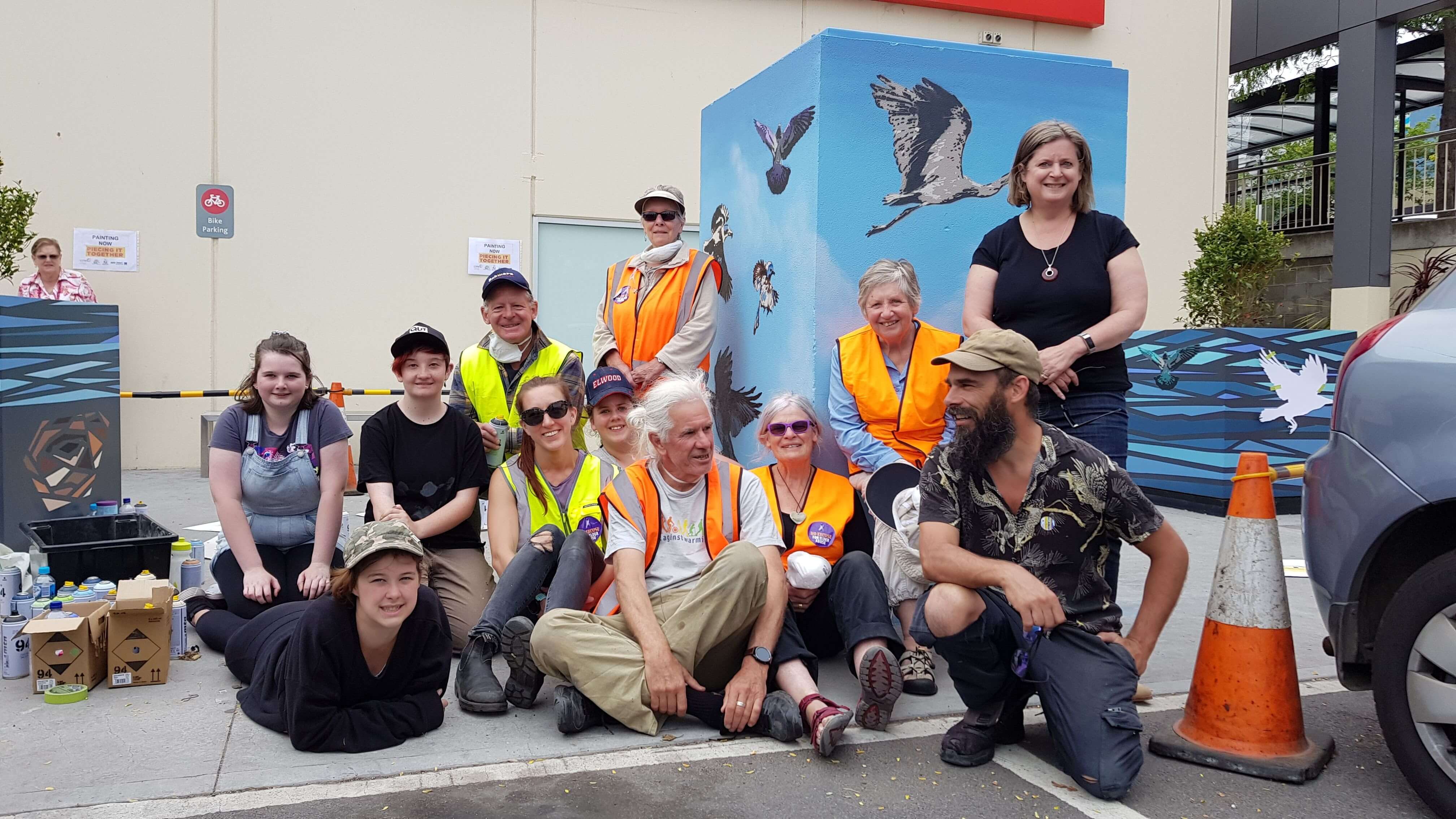 The art project took three days of painting to complete. Across this time, participants learned spray paint techniques, how to use masking tape as a stencil, and how to apply their layered bird stencils, supporting each other to complete the piece.