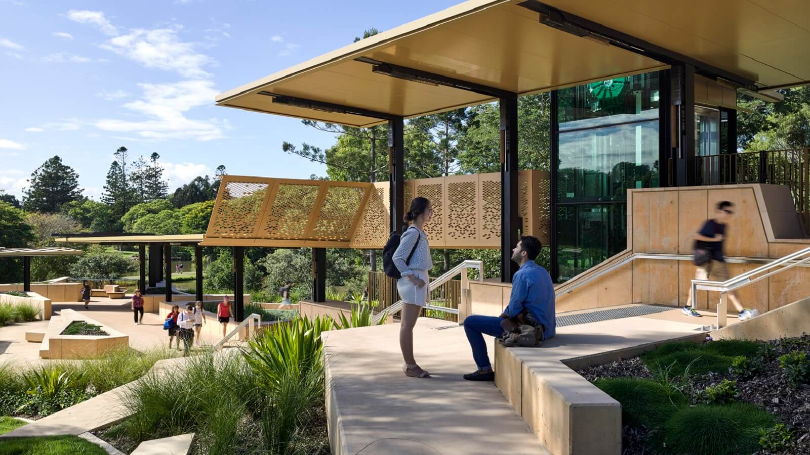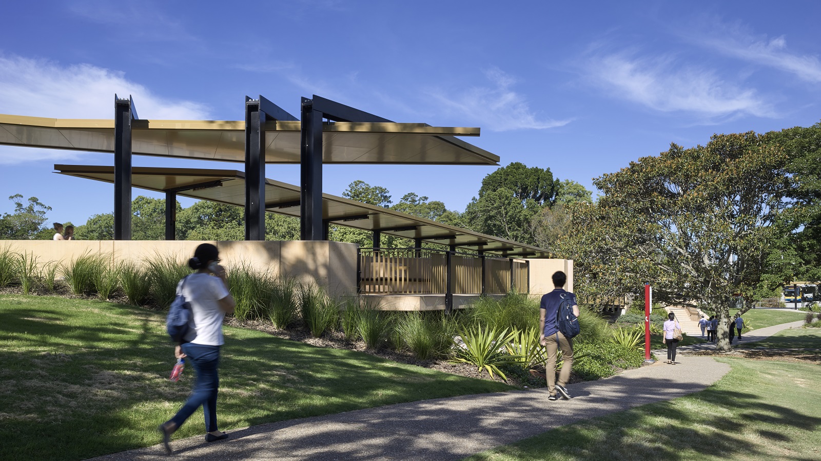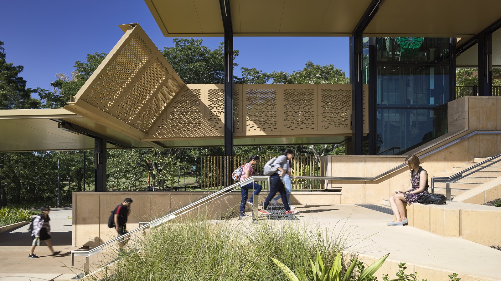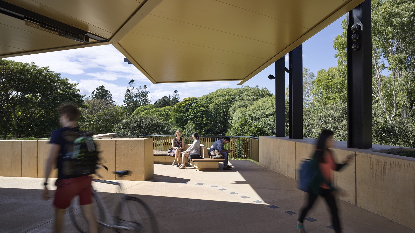 _“Our design encompasses a land bridge over a flood-prone gully and a series of canopied terraces enabling students to reach the Student Union from arrival via either the Eleanor Schonell Bridge or the UQ CityCat Terminal. The journey is articulated in a series of segmented parts accommodating disability ramp lengths and providing different outlooks over the campus’s green belt and lakes." _(Cox Architecture, 2016, para. 2).