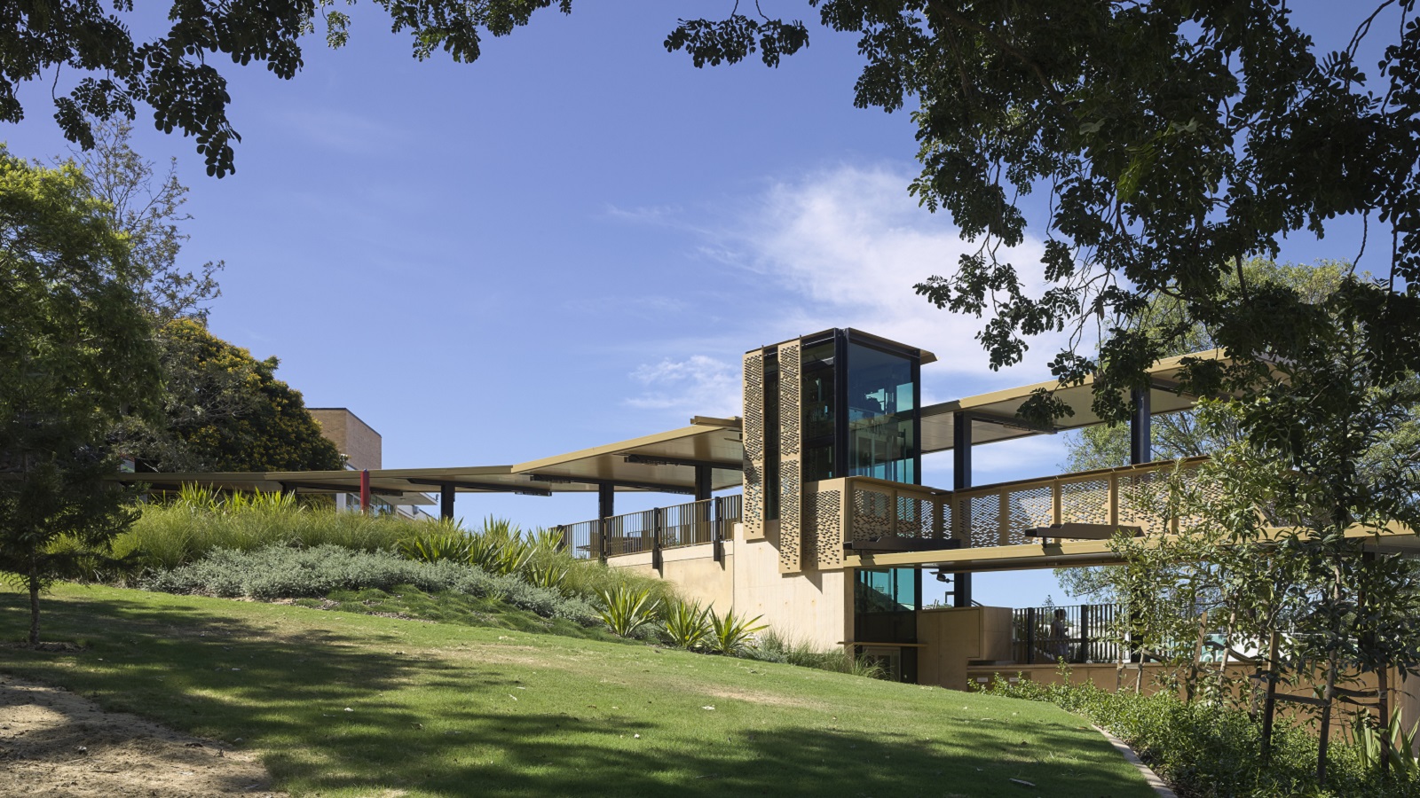 _"The design is characterised by its moulding to the topography and by stepped canopies which allow views up into the campus as people climb, and down to the alumni forest and lakes as people descend. A layer of perforated screens enriches this experience."_ (Cox Architecture, 2016, para. 2).