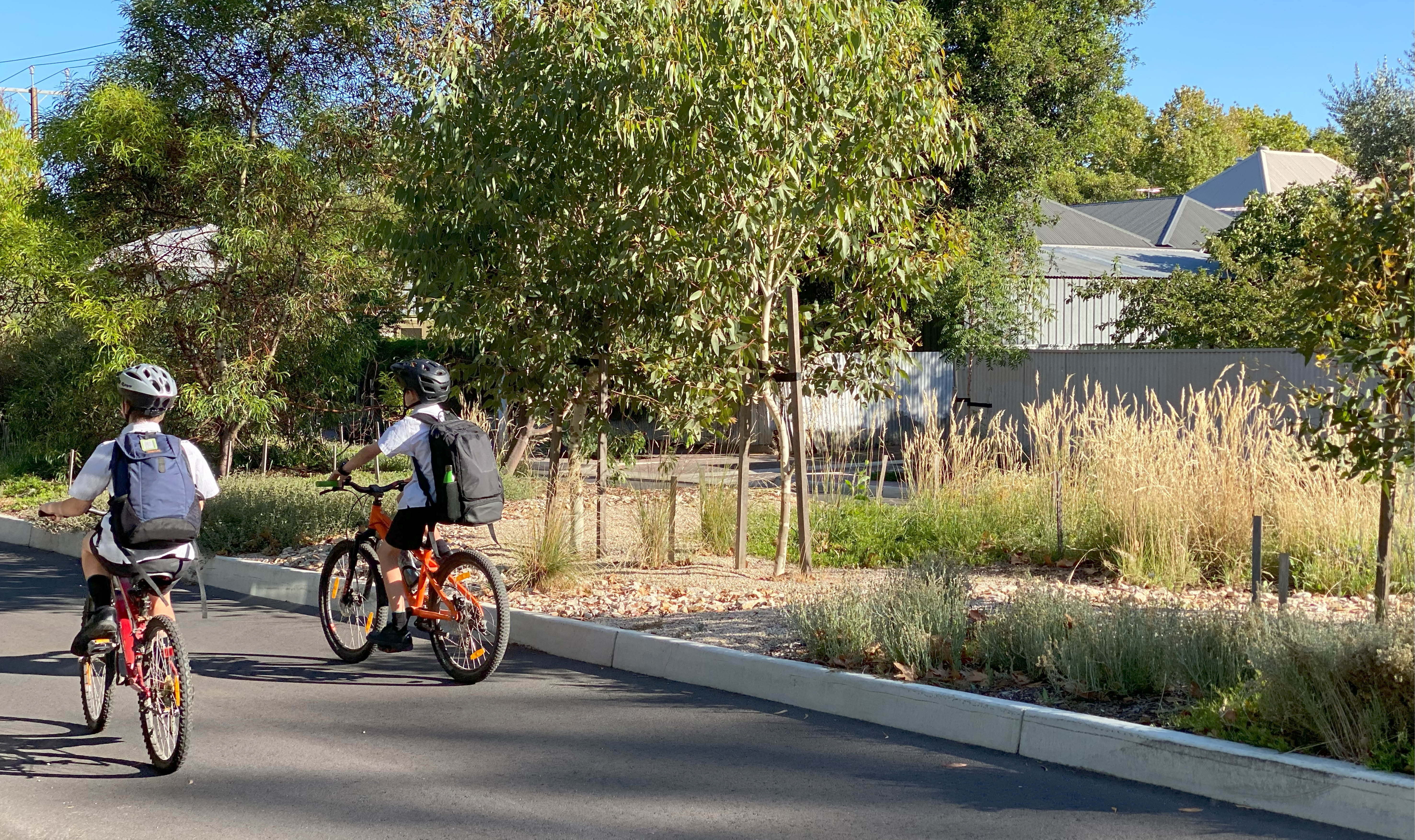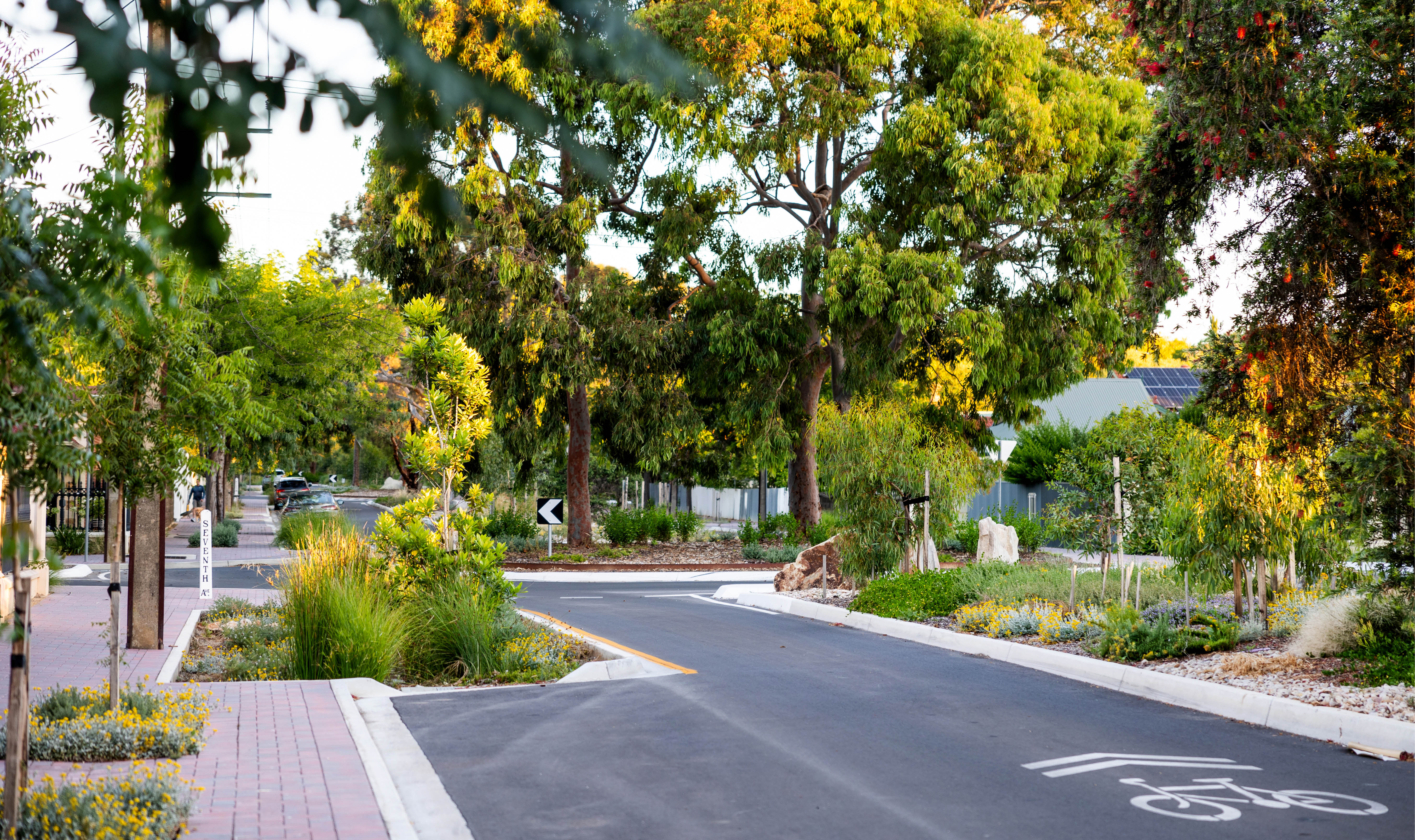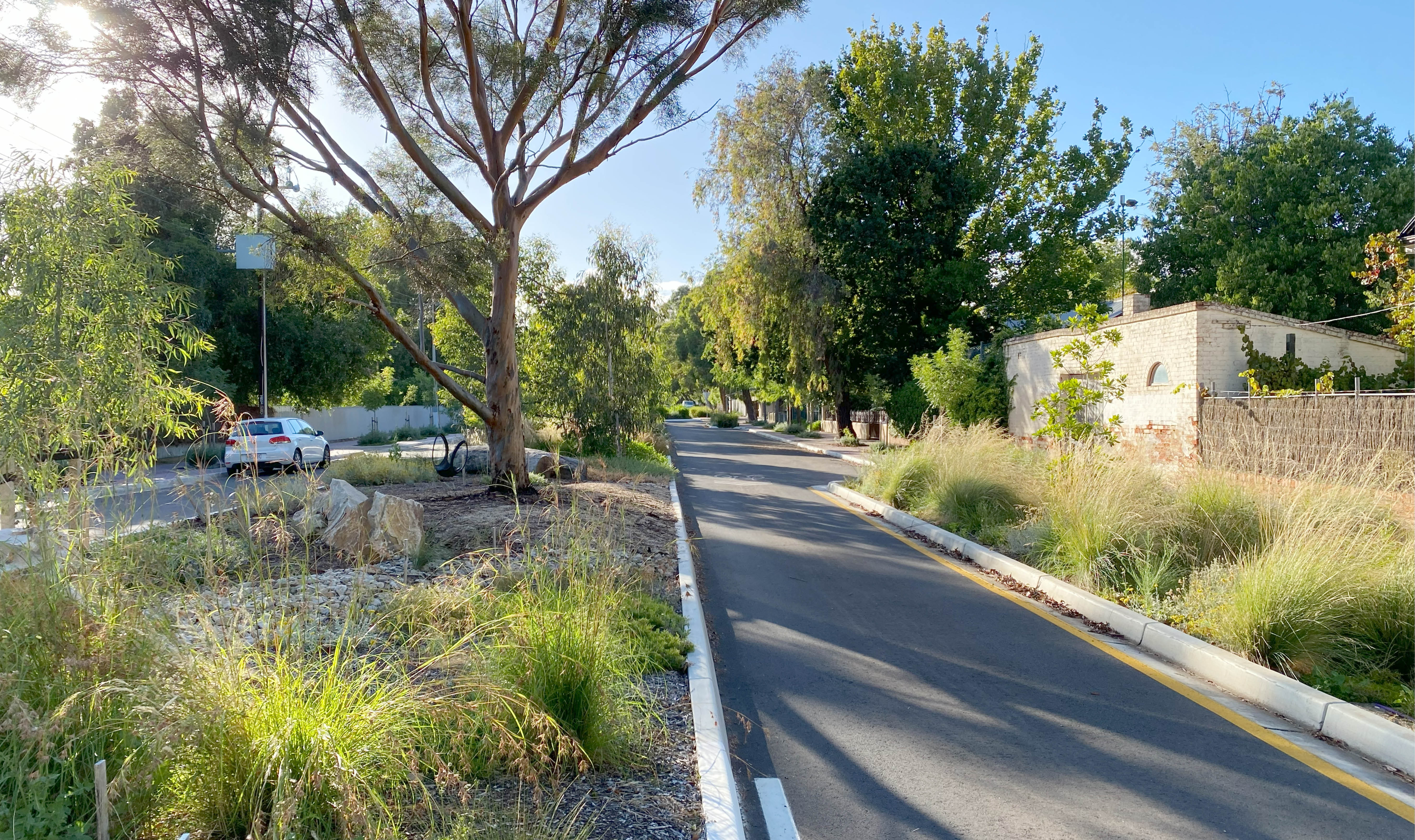 Water-sensitive urban design (WSUD) is a key design feature. Garden beds and trees are irrigated with recycled water sourced from the Linde Reserve aquifer recharge system, allowing plants and trees to establish quickly. WSUD and swale species support cleaner waterways, and local area flood management has been improved with the installation of new infiltration swales. New stormwater infrastructure enables 2.5 megalitres of stormwater to infiltrate the strata every year. This work makes a substantial contribution to greening the city and supports Council’s broader commitment to delivering green infrastructure in the greater Adelaide area.